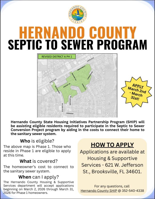 As a result of the Florida Springs and Aquifer Protection Act signed into law by the Governor in July, 2016, Hernando County was tasked to find ways to comply with the requirements associated with the 2016 legislation and developed restoration plans (BMAPS). The Septic to Sewer Conversion Plan is Hernando County Utility Department's (HCUD) response to the state mandated Onsite Sewage Treatment and Disposal System Remediation Plan requirement for Weeki Wachee Springs (more detailed information can be found under Project Overview on side panel).